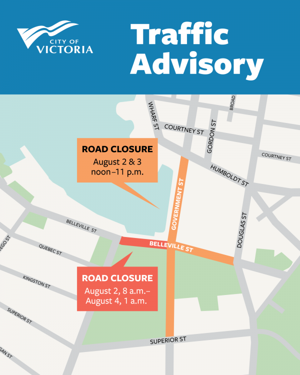 Victoria, BC – Road closures will be in effect around the Inner Harbour this Saturday and Sunday, August 2 and 3, for the Symphony Splash. VicPD will also be deploying temporary, monitored CCTV cameras and the Remotely Piloted Aircraft System (RPAS) to assist in public safety during the family-friendly event.