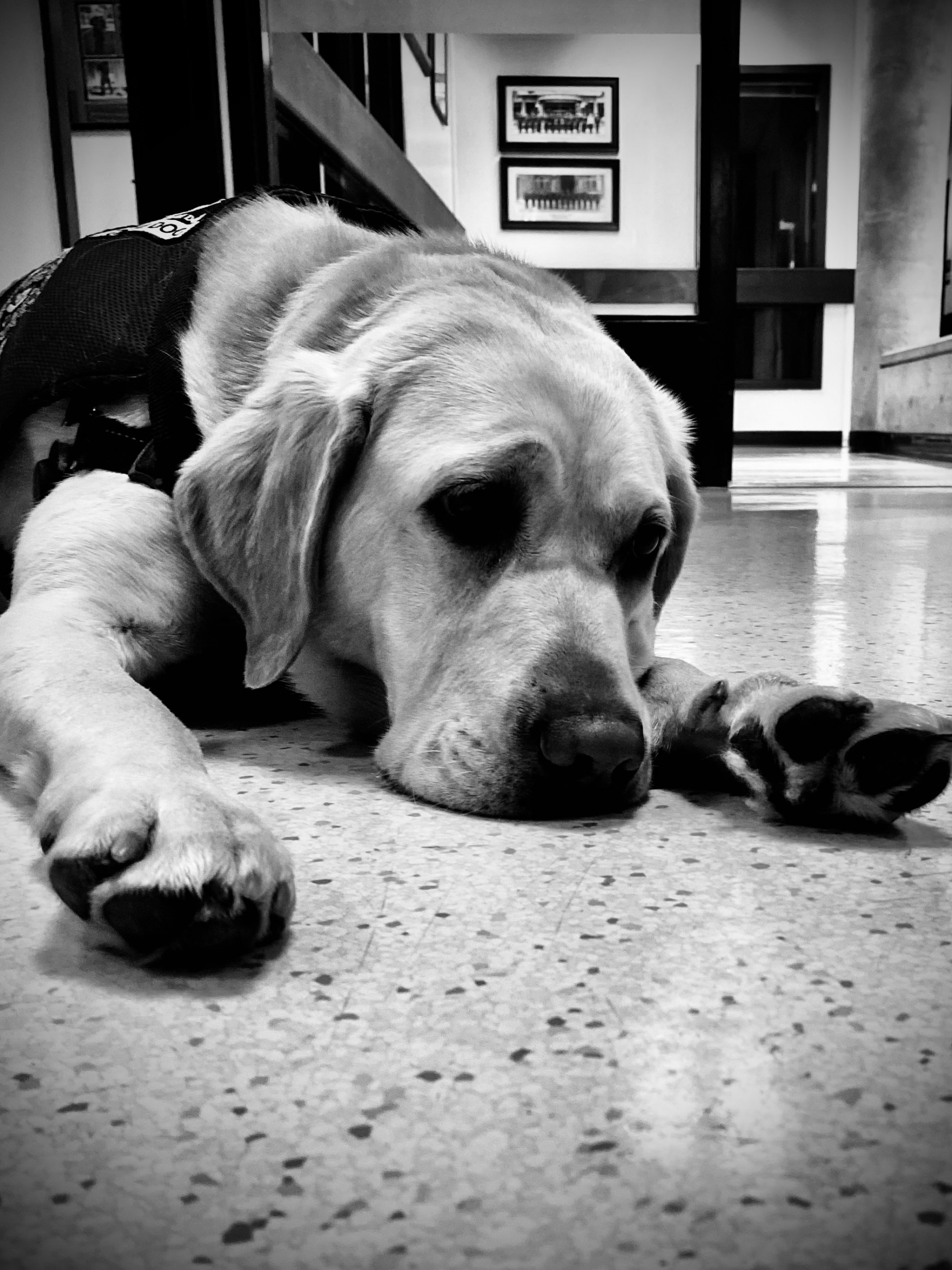 Daisy, VicPD’s Operational Stress Intervention Dog, takes quiet moments — reminders of the importance of self-care and acknowledging the emotional weight of supporting others.