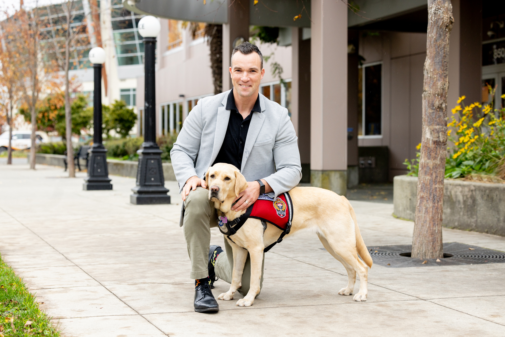 VicPD’s dedicated Operational Stress Intervention Dog, Daisy, with one of her handlers, Detective Sgt. Matt King, outside police headquarters.