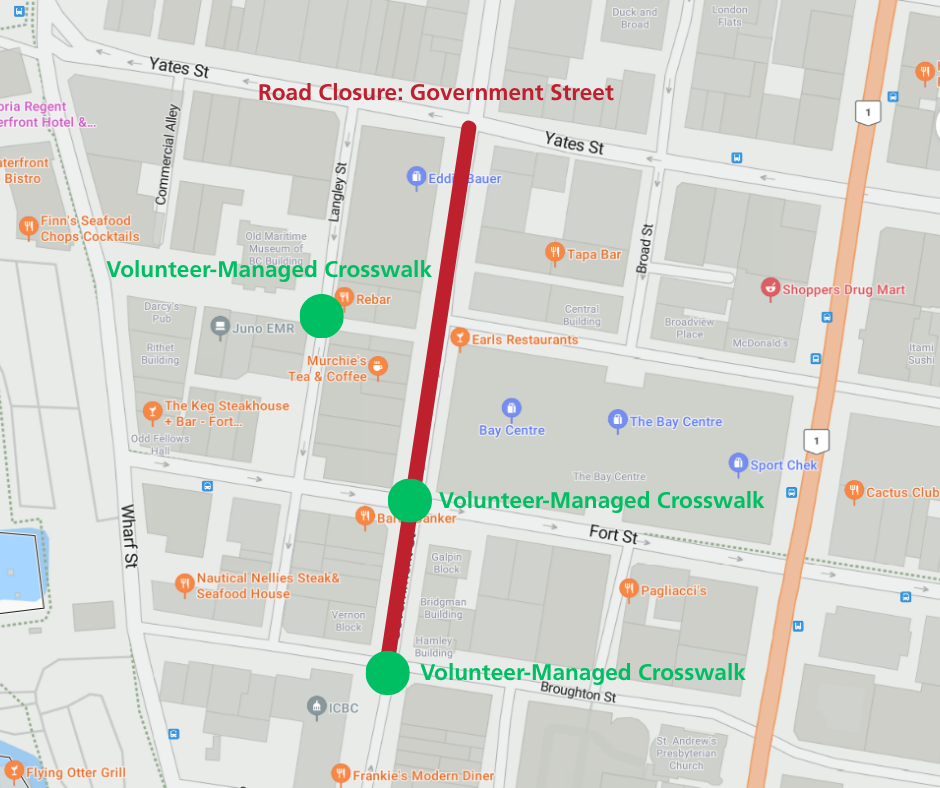 Map of road closures and managed crosswalks for Wicked Victoria.