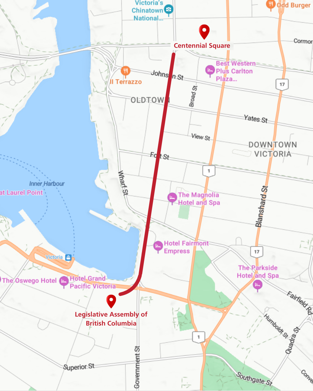 Participants will begin to gather at Centennial Square at 9:30 a.m. with the march starting at about 10:15 a.m. The route will proceed south on Government Street from Centennial Square to the B.C. Legislature. Rolling road closures will be in effect along this route as the march progresses.