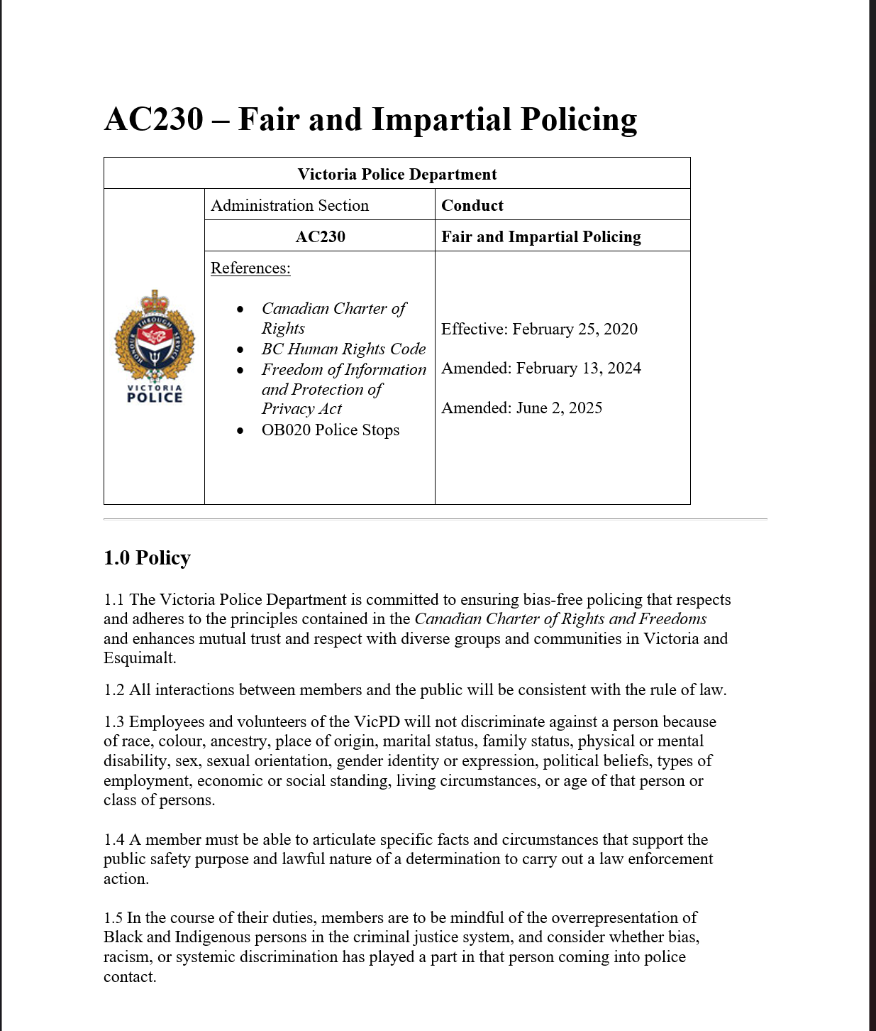 VicPD Policy AC230 Fair & Impartial Policing