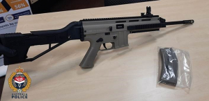 Officers arrested the woman a short distance away and searched her following the arrest. They located a heavily modified, assault-style .22 calibre rifle and a magazine loaded with twenty rounds, as well as ammunition for other firearms. A photograph of the weapon and ammunition is below.